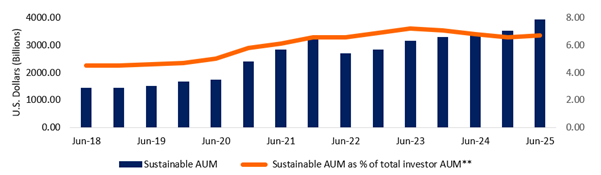 ** % compares between sustainable and ‘Traditional’ funds from a universe of 99,000 global funds, ”Sustainable” uses Morningstar’s definition.