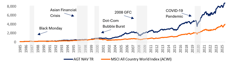 Over four decades, this framework has proved remarkably resilient. It has delivered consistent long-term performance through multiple market regimes: inflationary shocks, technology booms, credit cycles, and more recently, the rise of stewardship and sustainability (Figure 4.). Since 1985, AGT has compounded NAV at approximately +11.5% per annum, outperforming global equity indices (such as the MSCI ACWI) over the same period (Figure 1.).