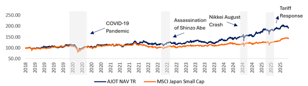 That philosophy has continued to guide us across multiple economic and valuation regimes. Since assuming management of the AVI Global Trust (AGT) in 1985 and launching the AVI Japan Opportunity Trust (AJOT); we have invested through Black Monday, the Asian financial crisis, the dot-com boom, the global financial crisis and the COVID-19 pandemic; periods that tested liquidity, patience and process. Over this long term, AGT, and since 2018, AJOT, have demonstrated resilient long-term performance (see Figure 1. and Figure 2.); driven not by leverage or style rotation, but by systematic exploitation of structural inefficiencies: discounts in holding companies, mispriced closed-end funds, and under-researched, asset-backed businesses. Our approach since 1985 has become more data-intensive and engagement-driven over time, but its foundation, the search for intrinsic value and alignment with disciplined owners, remains as it was.